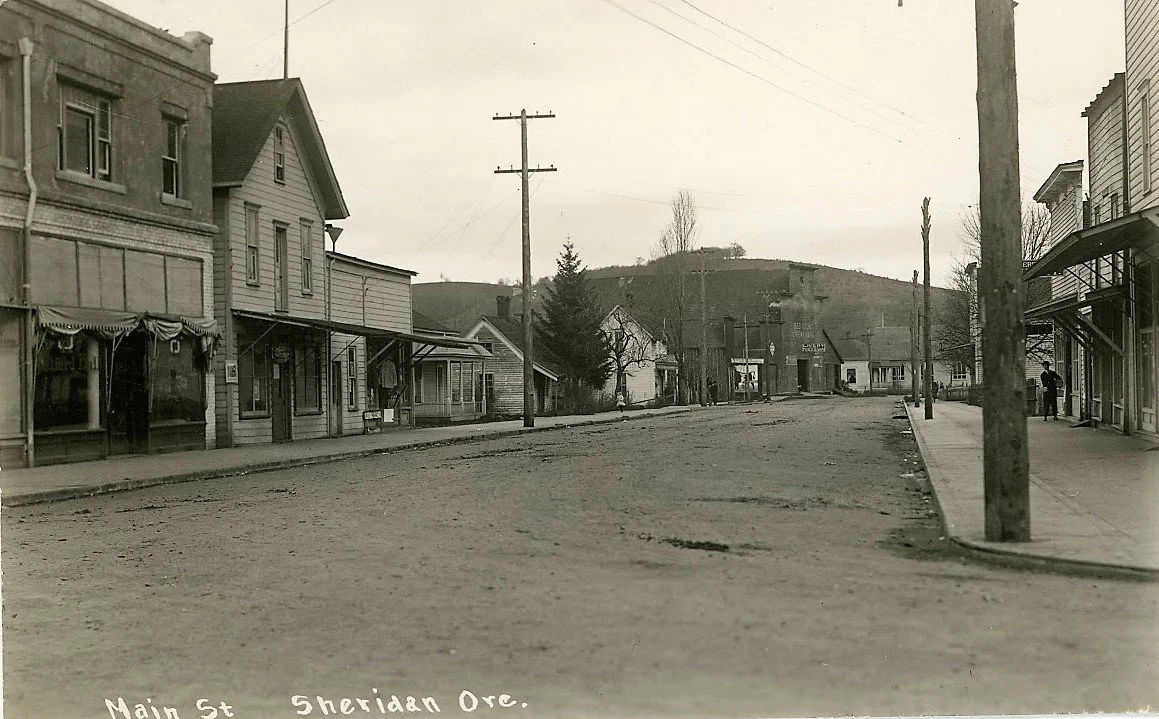 The Sheridan Lumber Company built a flume started in 1907 to bring cants of timber to the Sheridan Mill from the Mill Creek Mill. It was used until 1918 when it fell into disuse. The farmers would often plant their gardens below the flume to take advantage of the water overflow. The men on the top of the flume could be the flume walkers used to keep the cants from jamming.